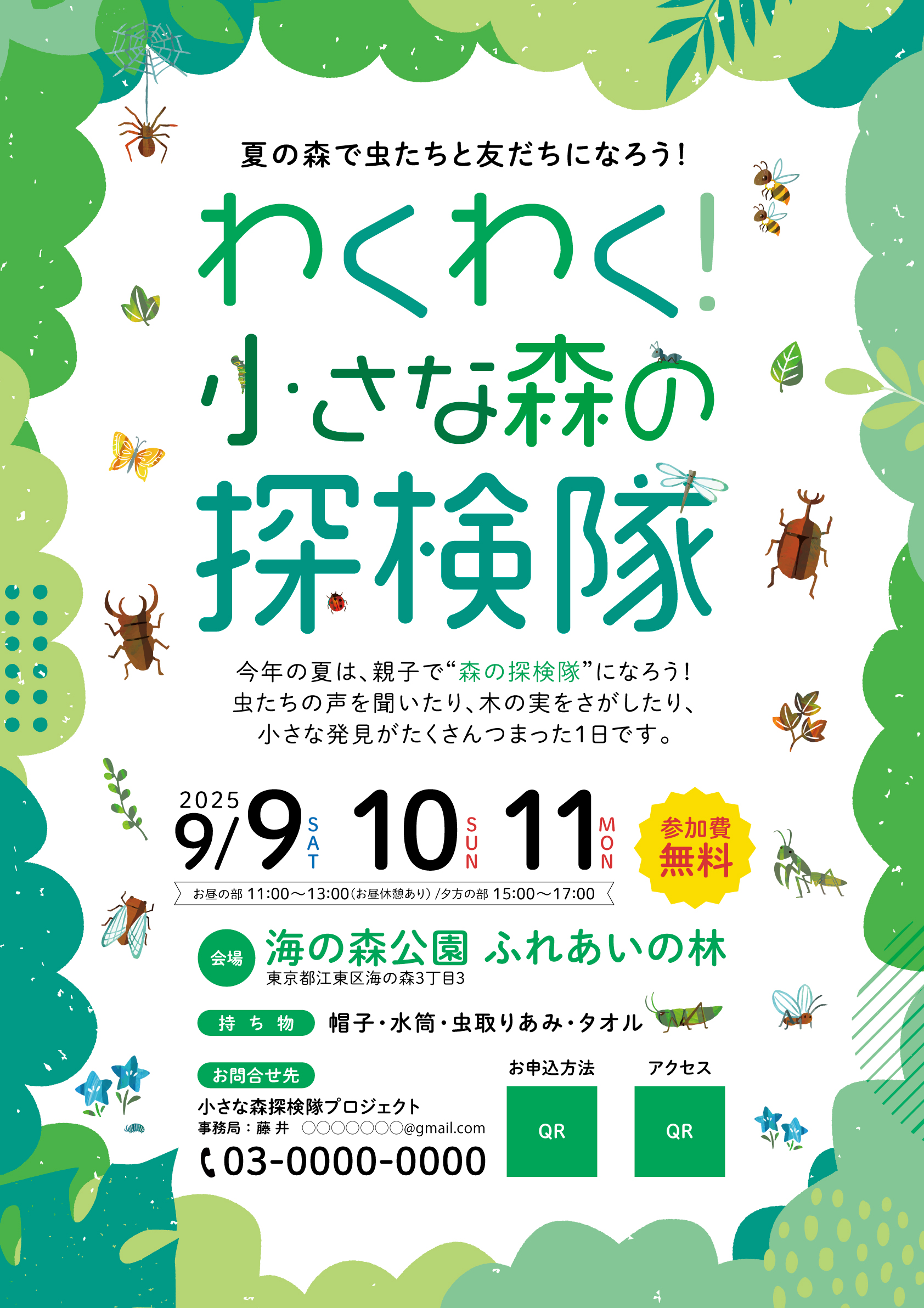 | デザイン | ①森をテーマに、自然の躍動感とワクワクする世界観を表現したデザインに仕上げました ②虫のイラストを使用し、子どもたちが思わずワクワクするようなデザインに仕上げました |