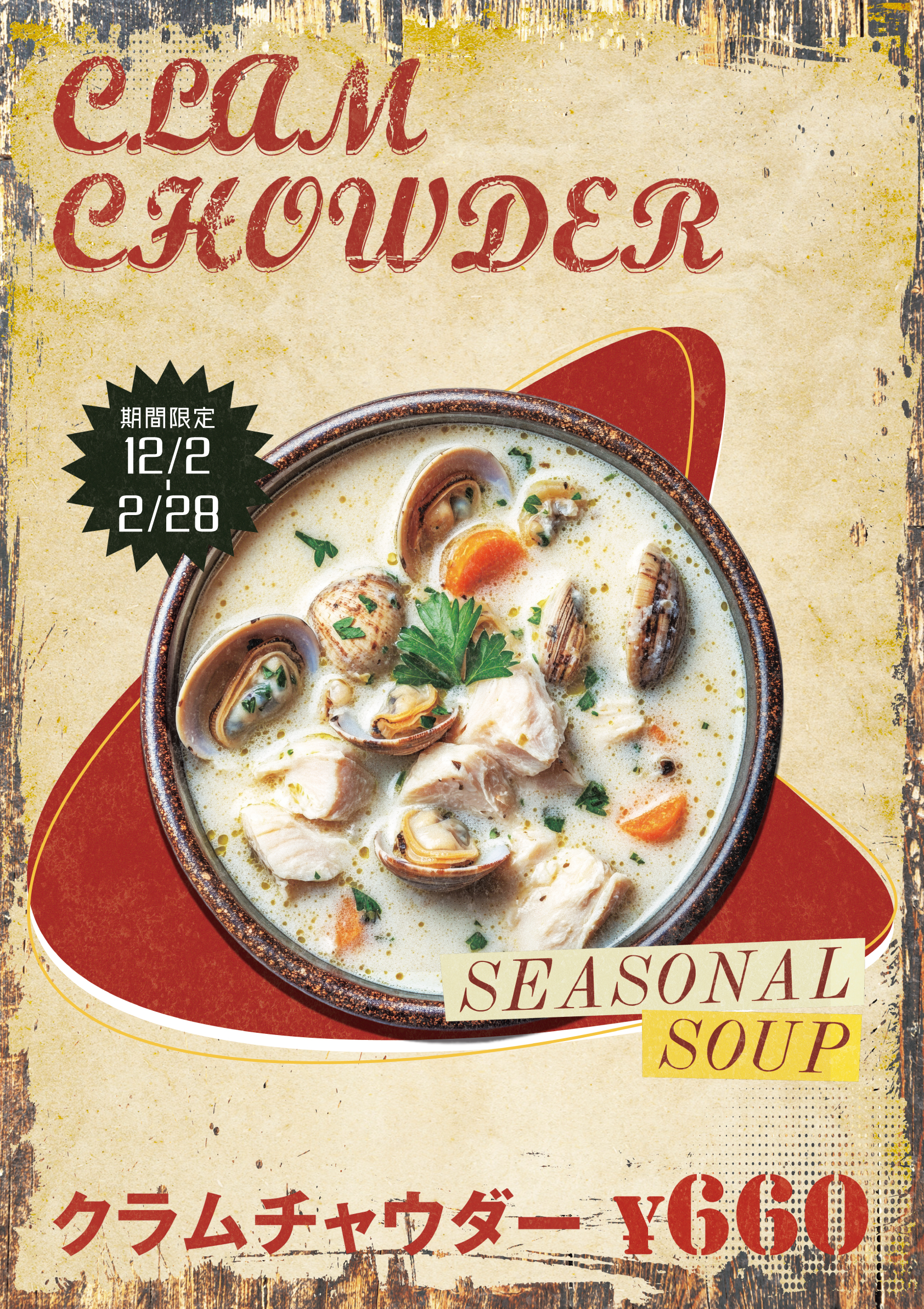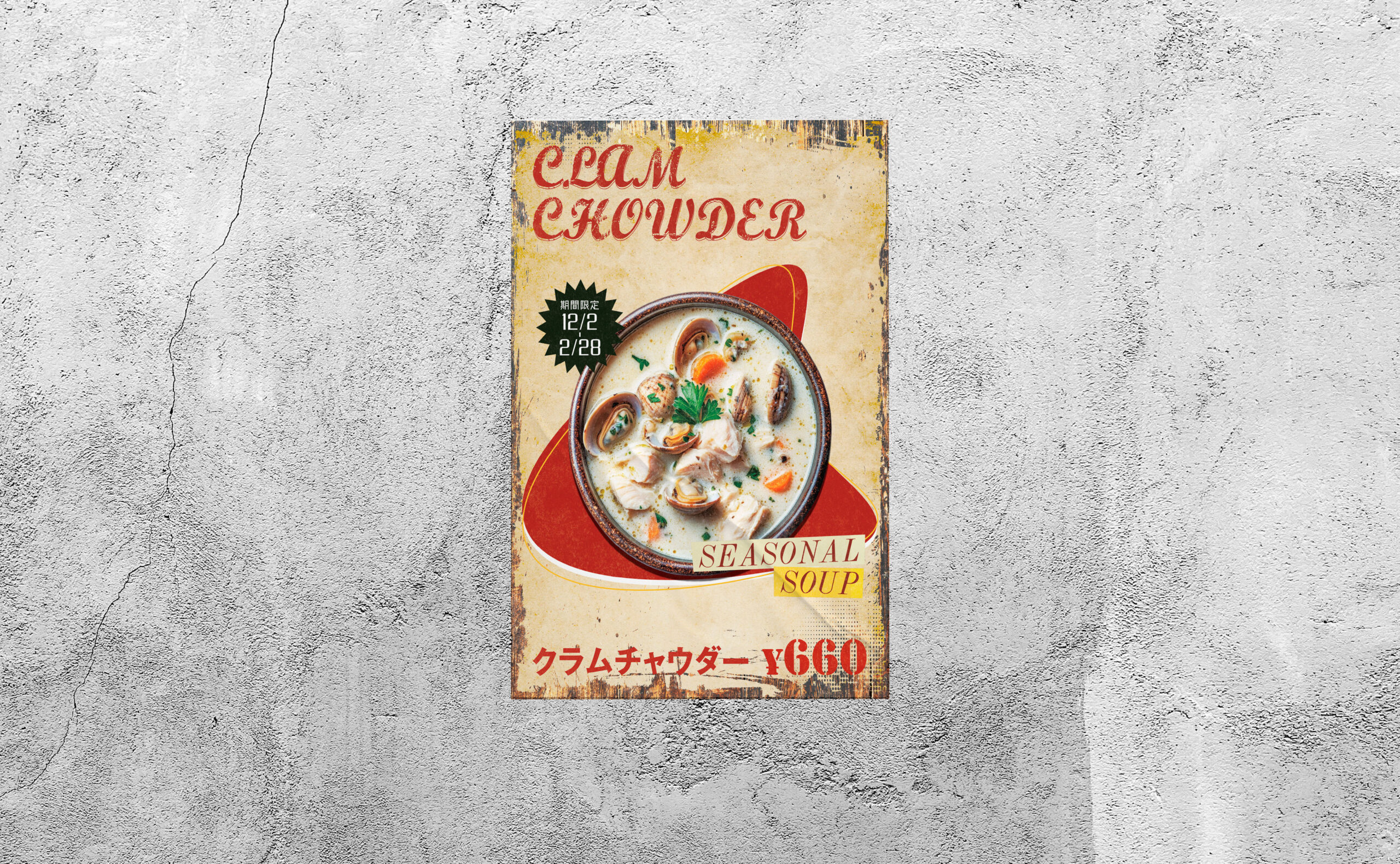 ②クラムチャウダーの写真を大きく配置し、見た瞬間に強いファーストインパクトを与えるデザインに仕上げました。